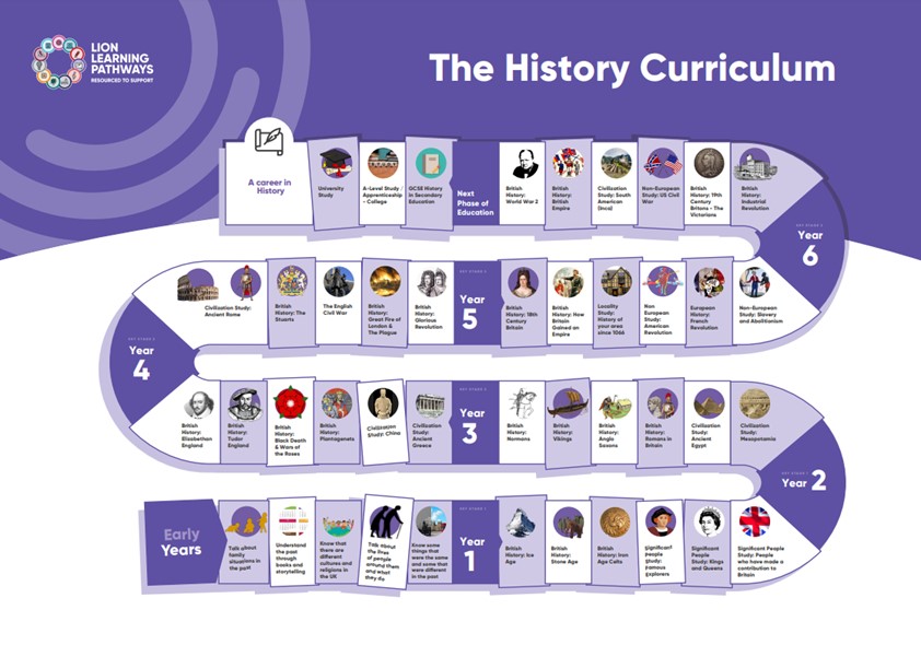 Our aim is to encourage children to develop an appreciation of and understanding from the earliest times to the present day. We aim to deliver a history curriculum that is accessible to all and that will maximise the outcomes for every child so that they know more, remember more and understand more. We aim for it to stimulate children’s curiosity about the past, increasing and developing their historical skills, concepts, knowledge and attitudes; thereby developing their interest in the past, arousing their curiosity and motivation to become active learners with a passion for history.